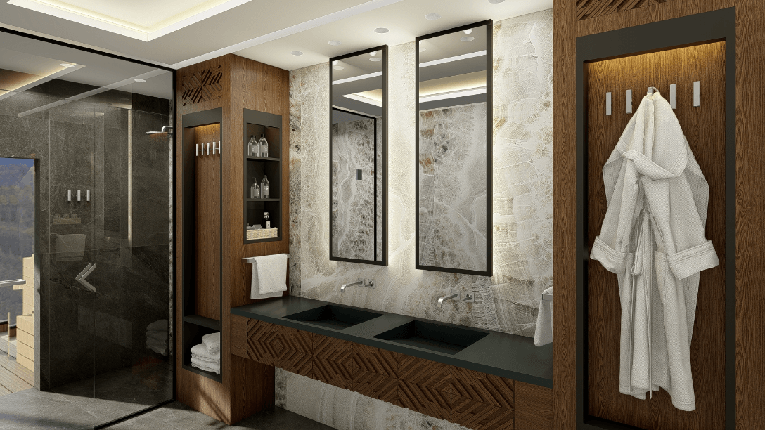 W większości apartamentów znajdują się: gabinet biznesowy (miejsce do pracy), strefa wypoczynku dziennego (salon TV), sypialnia, łazienka, jadalnia.