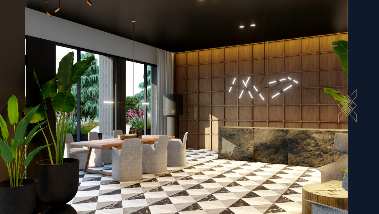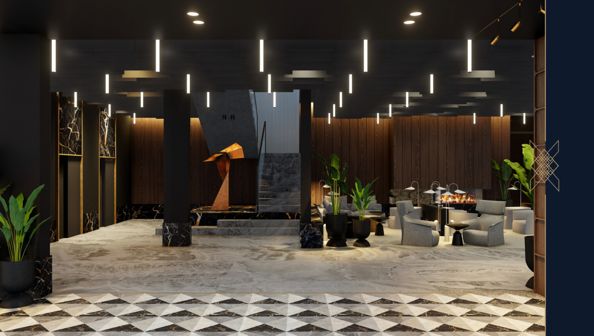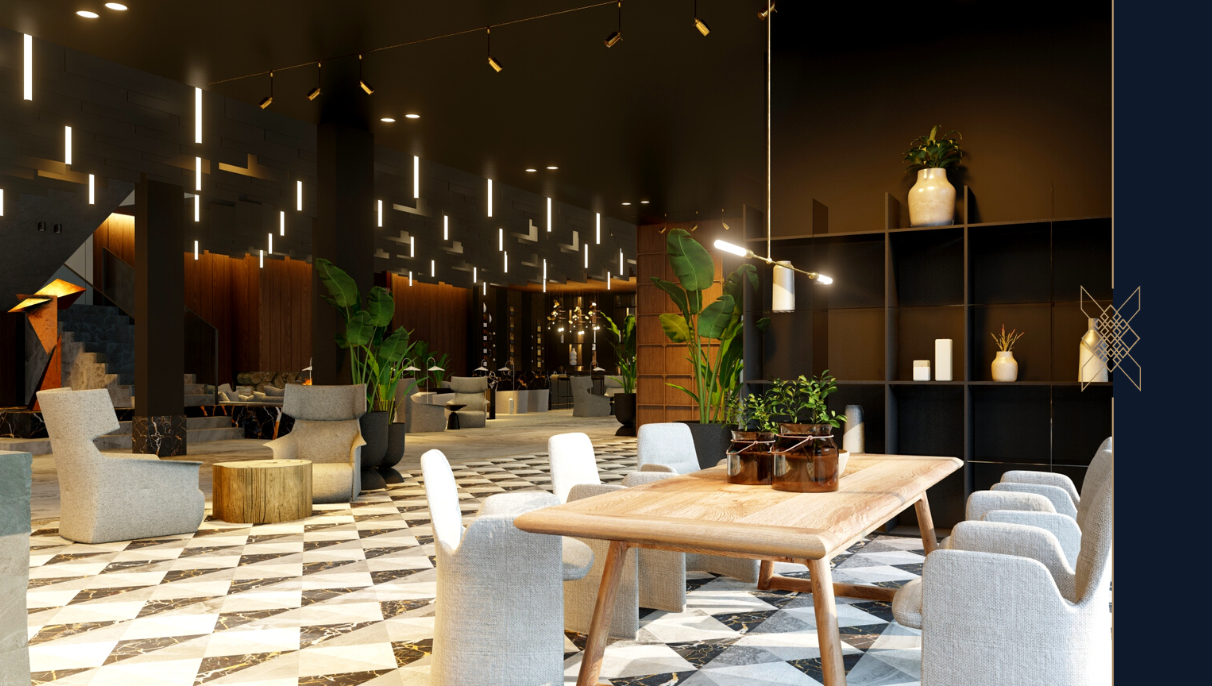 Wizualizacje lobby i recepcji projektowanego Hotelu Collis