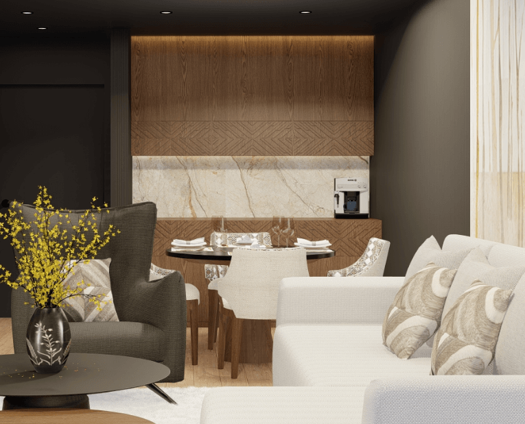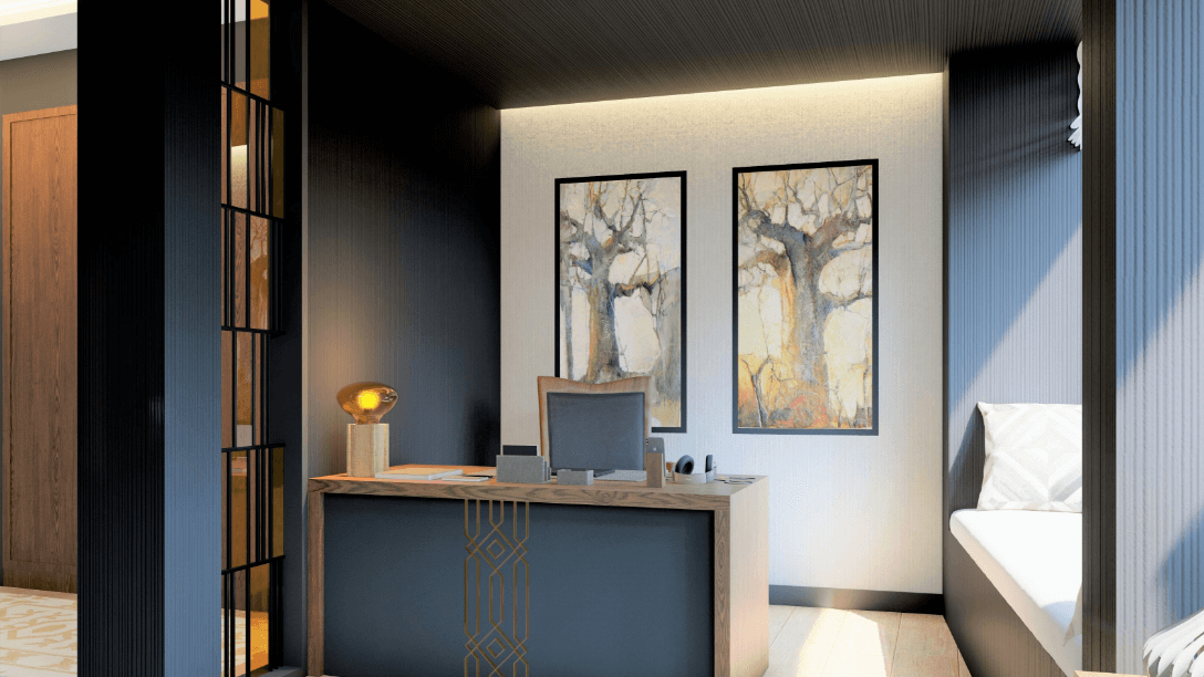 W większości apartamentów znajdują się: gabinet biznesowy (miejsce do pracy), strefa wypoczynku dziennego (salon TV), sypialnia, łazienka, jadalnia.