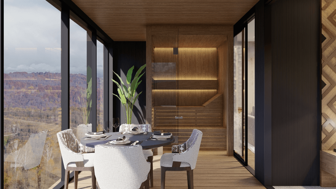 W poszczególnych apartamentach, posiadających strefę relaksu, znajdują się dodatkowe atrakcje: biokominek, hot tub, leżanki infrared, sauna infrared, ogródki (apartamenty na parterze), każdy z pięknym widokiem na okolicę. Na poziomie +4 znajduje się 12 komfortowych penhouse’ów z przepięknym widokiem i otwartymi tarasami.