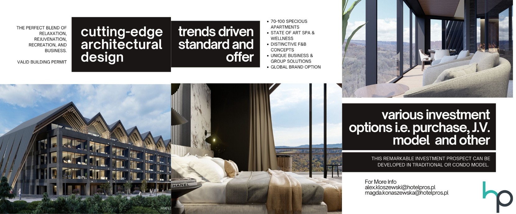 ✔️ różne modele investycyjne, w tym partnerstwo joint venture ✔️ pozwolenie na budowę ✔️ 5* luksusowy hotel ✔️ 70-100 przestronnych apartamentów ✔️ SPA & Wellness ✔️ przestrzeń konferencyjna i biznesowa ✔️ 4 butikowe koncepty gastronomiczne ✔️ parking & lądowisko dla helikopterów ✔️ spectakularne widoki ✔️ duża działka